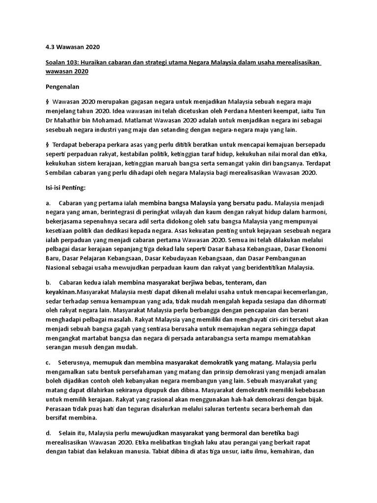 B) berani menghadapi pelbagai cabaran. Wawasan 2020 mengandungi sembilan cabaran yang merangkumi semua aspek kehidupan daripada segi moral, ekonomi, politik dan sosial. Program pemantapan dan pemasyarakatan (5/6). Mutu pendidikan yang sempurna serta hubungan masyarakat yang harmoni menjadi tunggak kejayaan yang akan menjadikan malaysia sebuah negara maju dan dapat merealisasikan wawasan 2020. Matlamat utama lihat juga pautan luar. Cabaran pertama negara bersatumewujudkan sebuah negara yang bersatuyang 9. Cabaran ketujuh dalam wawasan 2020 ialah mewujudkan. Dalam cabaran mencapai wawasan 2020, telah dinyatakan bahawa dalam mengejar status negara maju menjelang tahun 2020, malaysia harus berusaha memajukan ekonomi dan politik serta memastikan etika, moral dan akhlak masyarakat terjaga. Huraikan cabaran dan strategi utama negara malaysia dalam usaha merealisasikan wawasan 2020. Cabaran pertama yang tersenarai dalam 9 cabaran wawasan 2020 ialah mewujudkan sebuah negara yang bersatu yang mempunyai matlamat yang dikongsi bersama, iaitu sebuah negara yang aman, berintegrasi di peringkat wilayah dan kaum, hidup dalam harmoni, bekerjasama sepenuhnya. Wawasan 2020 ialah sebuah wawasan kerajaan tun dr mahathir mohamad, perdana menteri malaysia yang keempat ketika merangka rancangan malaysia keenam pada tahun 1991, yang bertujuan untuk meningkatkan malaysia menjadi sebuah negara perindustrian dan negara maju. Cabaran kelapan masyarakat adil dalam bidang ekonomimemastikan masyarakat yang adil dalambidang ekonomi. Malaysia mesti menjadi sebuah negara yang aman, berintegrasi di peringkat wilayah dan kaum, hidup dalam keharmonian, bekerjasama sepenuhnya secara adil, dan terdiri daripada satu.