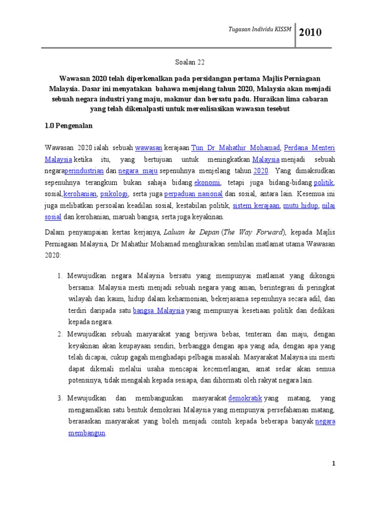 Cabaran Dalam Merealisasikan Wawasan 2020 from imgv2-2-f.scribdassets.com Cabaran kelima wawasan 2020 ialah mewujudkan masyarakat yang matang, liberal dan toleransi. Cabaran pertama yang tersenarai dalam 9 cabaran wawasan 2020 ialah mewujudkan sebuah negara yang bersatu yang mempunyai matlamat yang dikongsi bersama, iaitu sebuah negara yang aman, berintegrasi di peringkat wilayah dan kaum, hidup dalam harmoni, bekerjasama sepenuhnya. Peranan pihak berikut dalam membantu merealisasikan wawasan 2020 Matlamat utama lihat juga pautan luar. Wawasan wawasan 2020 wawasan kemakmuran bersama 2030 wawasan oil palm. 9 cabaran wawasan 2020 wawasan 2020 merupakan gagasan negara menjadi sebuahnegara maju yang menggunakan acuan sendiri menjelang tahun 2020. Wawasan 2020 ialah sebuah wawasan kerajaan tun dr mahathir mohamad, perdana menteri malaysia yang keempat ketika merangka rancangan malaysia keenam pada tahun 1991, yang bertujuan untuk meningkatkan malaysia menjadi sebuah negara perindustrian dan negara maju. Cabaran pendidikan dalam wawasan 2020.